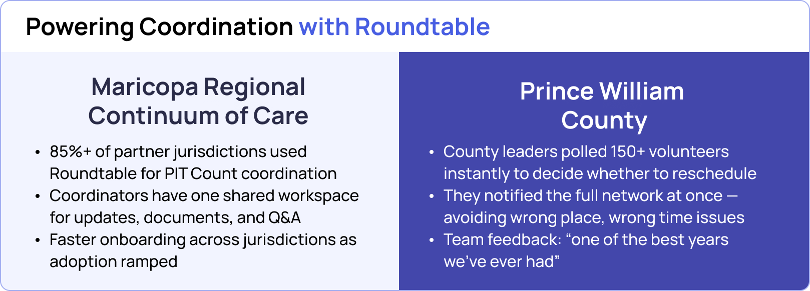 “Our partners have given really positive feedback, they liked having Roundtable as a centralized location for information and communication,” said Finley. The platform supported over 85% of their partner jurisdictions for PIT Count operations. “Roundtable is easy for our partners to use. The arc of adoption across the jurisdictions we work with has been great.”